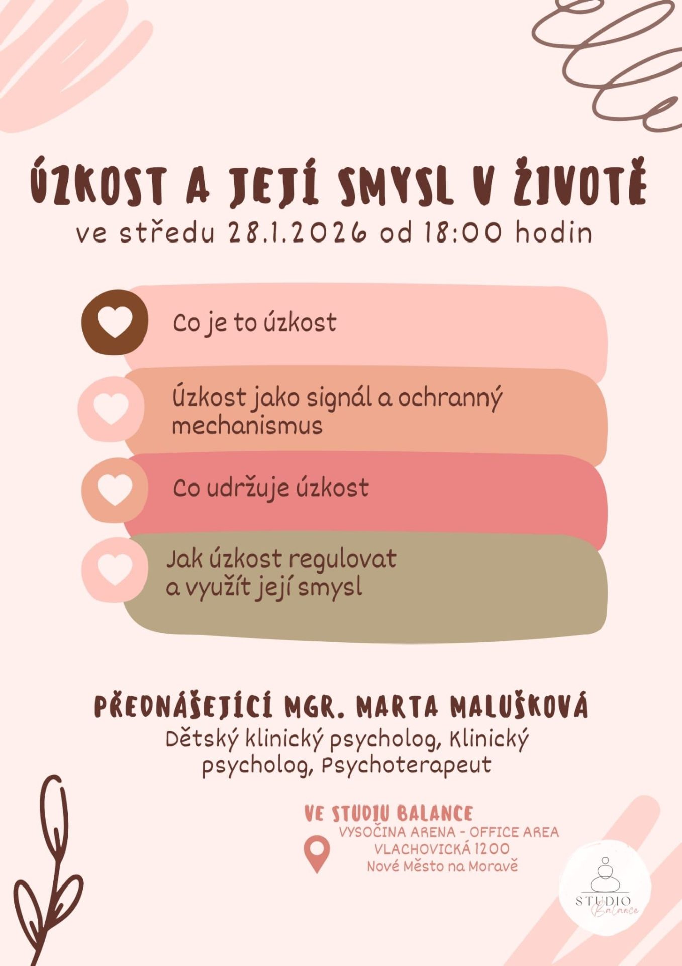 Ve Studiu Balance se ve středu 28. ledna uskuteční přednáška s názvem Úzkost a její smysl v životě v 18:00 hodin pod vedením Petry Menšíkové.