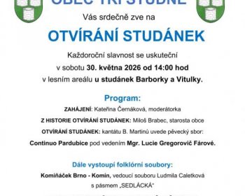 Obec Tři Studně Vás srdečně zve na Otvírání studánek v sobotu 30. května od 14:00 hodin v lesním areálu u studánek Barborky a Vitulky.