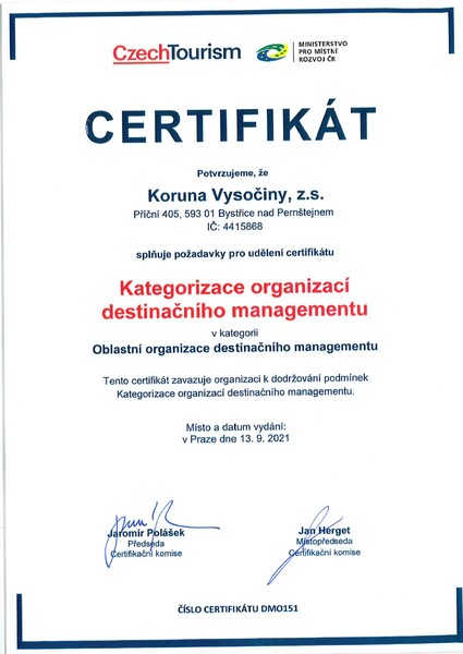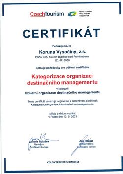 Certifikát s platností na 1 rok byl DMO Koruna Vysočiny, z.s. udělen 13.9.2021.