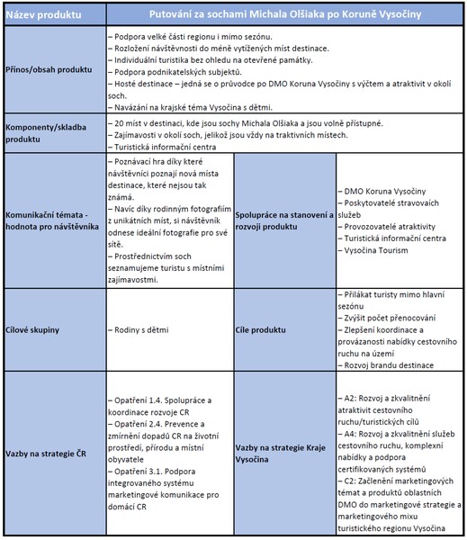 Hlavním cílem produktu Putování za sochami Michala Olšiaka po Koruně Vysočiny je připravit vícedenní program pro rodiny s dětmi pomocí turistické hry, která je provede Korunou Vysočiny.