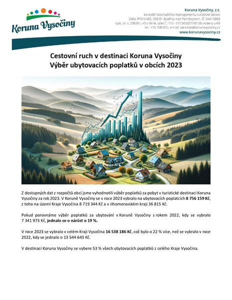 Pravidelně sbíráme data od obcí v destinaci a vyhodnocujeme výbět poplatků za pobyt. Na základě získaných dat připravujeme územní srovnání výběru poplatků v Koruně Vysočiny.