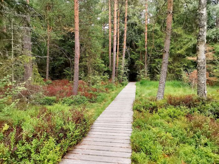Trasa zahrnuje dvanáct zastavení s informačními panely a dvě vyhlídková místa, kdy v nejvíce exponovaných místech zpřístupněným územím prochází dřevěný povalový chodník. Kdysi byla tamní kvalitní rašelina dobývána jako zdroj paliva, nyní jsou rašeliniště chráněnou přírodní památkou. K první tabuli přibližující unikátní území a krajinu připomínající severskou tundru se dostanete po modré turistické značce od loděnice u Velkého Dářka. Dřevěný povalový chodníček nad rašeliništěm pak v jednom místě uhýbá přímo do nitra blatkového porostu. Kromě vzácné borovice blatky je tam k vidění například i suchopýr pochvatý, klikva bahenní a další typické rostliny, na něž upozorňují informační tabulky.