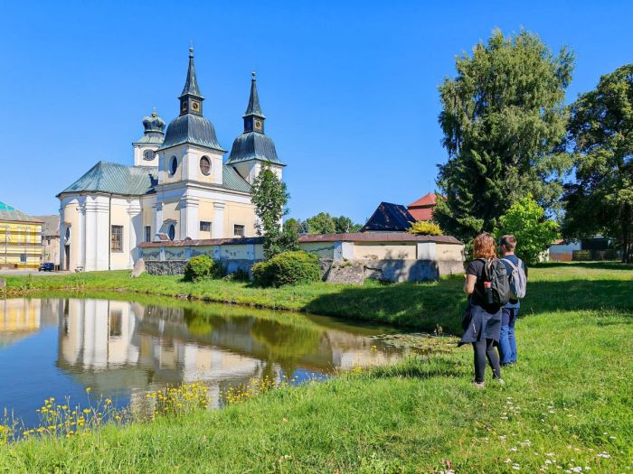 Výšlap spojuje tři z nich. Kostel sv. Václava ve Zvoli Santini přebudoval z původně značně zchátralého gotického svatostánku, přičemž mu dal půdorys řeckého kříže se střešní dominantou v podobě knížecí čapky coby atributu patrona chrámu. Toho, stejně jako opata Vejmluvu, připomíná také písmeno W ve vrcholu štítu západního průčelí kostela. Zájemci o komentovanou prohlídku mají možnost si ji předem domluvit s panem Svítilem na tel. 733 105 282.
