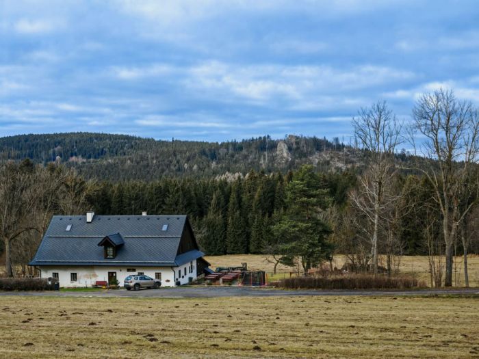 Od Devíti skal trasa zamíří po modré značce směrem ke Křižánkám. Po zhruba kilometru cesty lesem se vpravo od cesty „vyloupne“ hradba Bílé skály. Mohutný rulový útvar dlouhý asi šedesát metrů a dosahující výšky až třicet metrů je především ideálním terénem pro horolezce, avšak některé níže položené partie jsou přístupné i pro turisty. Modré značení pokračuje až na rozcestí, kde končí křižánecká naučná stezka Naše stromy, a poté se trasa odkloní vpravo na lesní komunikaci vedoucí k osadě Milovy. Přibližně v její polovině se po pravé straně nachází pamětní kámen s iniciálami F. J. I. a daty 18. 6. 1830 a 21. 11. 1916, který má údajně připomínat rakousko-uherského císaře Františka Josefa I. A to i přes skutečnost, že se mocnář nenarodil 18. června 1830, jak je na kameni vyryto, nýbrž až o dva měsíce později.