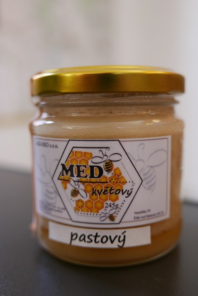 V dárkovém balení je med pastový, který se vyrábí šleháním, není tekutý a má i trochu jinou barvu. Výrobce AGS-EKO s.r.o. Veselíčko.