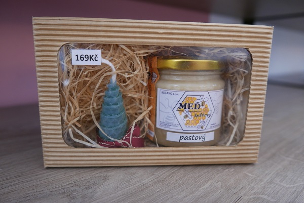 V dárkovém balení je med pastový, který se vyrábí šleháním, není tekutý a má i trochu jinou barvu. Výrobce AGS-EKO s.r.o. Veselíčko.