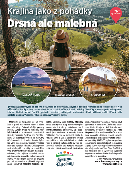 Ve spolupráci s Vysočina Tourism jsme připravili PR článek, který je publikován v příloze MF Dnes v České republiky. Cílem článku je představit Vysočinu jako ideální destinace s nádychem venkova a malebné krajiny.