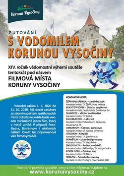 XIV. ročník vědomostní výherní soutěže, tentokrát pod názvem Filmová místa Koruny Vysočiny, je již tradiční a oblíbenou hrou turistů v naší oblasti. Letošní téma navazovalo na roční téma krajské DMO Filmová místa. Cílem bylo tedy rožšířit plynule navázat na téma kraje a detailněji představit jednotlivá místa spojená s touto tématikou v naší turistické oblasti.