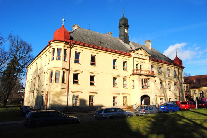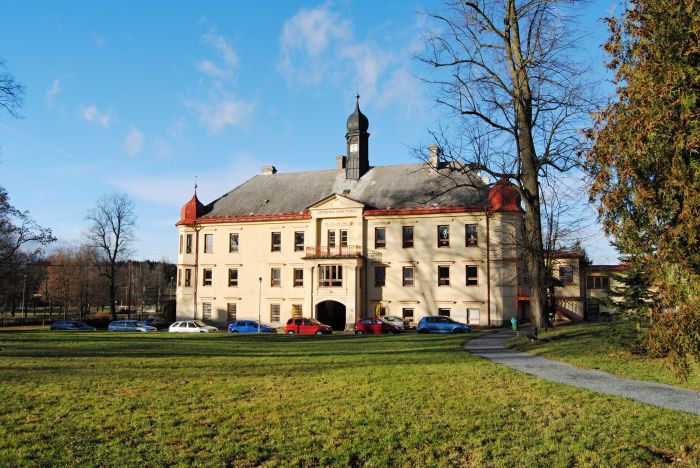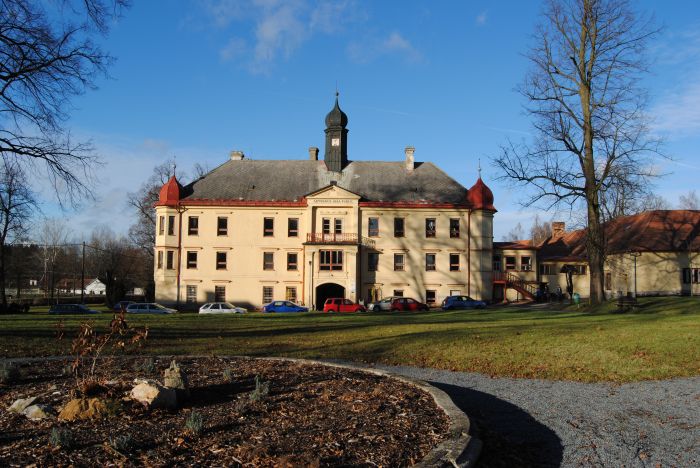 V roce 1459 byla poprvé zmíněna místní tvrz, která byla koncem 16. století přestavěna Pernštejny na renesanční zámek. Tento zámek měl čtvercový půdorys s nárožními věžemi a byl dvoupodlažní, což si zachoval dodnes. V letech 1781–1799 jej hrabě Jan Nepomuk Mitrovský z Mitrovic a Nemyšle rozšířil o druhé podlaží a objekty v nádvoří a klasicistně přestavěl. Po požáru v roce 1808 byl zámek přebudován Nepomukovým synem hrabětem Vilémem Mitrovským.