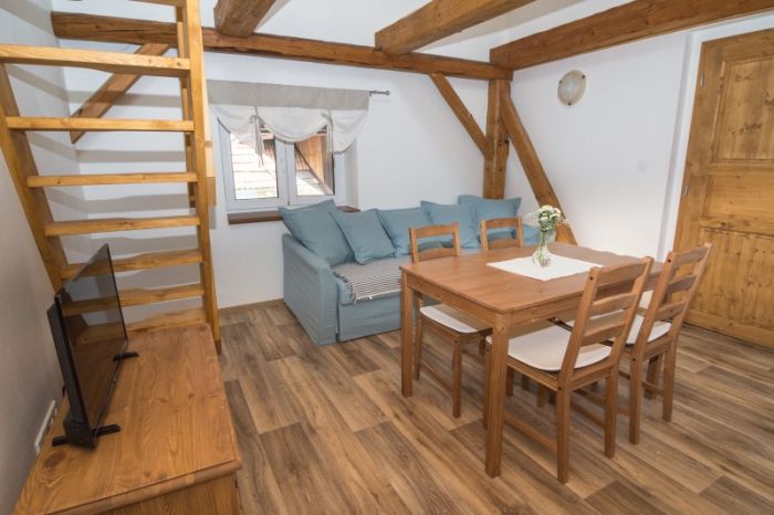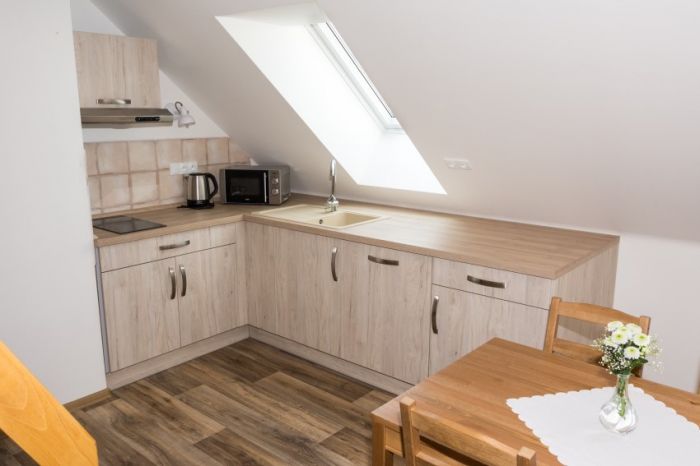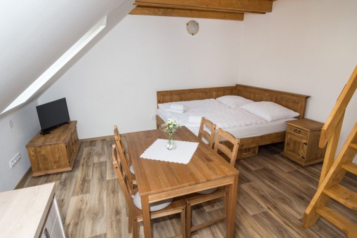 Apartmán Jaro - Kuchyňská linka je vybavena dvouplotýnkovým indukčním vařičem, vestavnou ledničkou s mrazáčkem, mikrovlnnou troubou a rychlovarnou konvicí. Je zde jídelní stůl s židlemi, televizní stolek s TV, 2 menší otevřené komody a manželská postel. Po mlynářských schodech se stoupá do podkroví, kde jsou 2 samostatná lůžka.