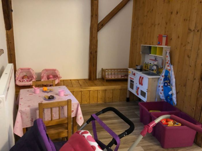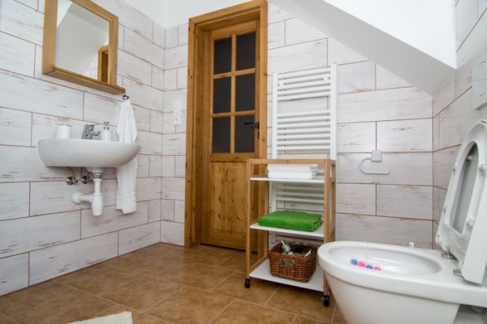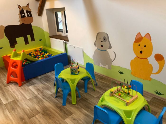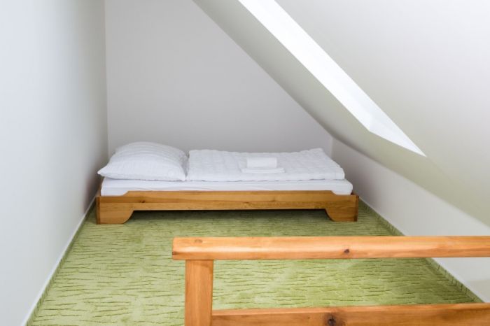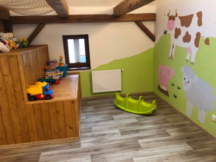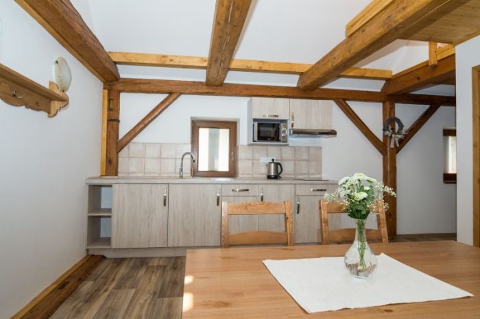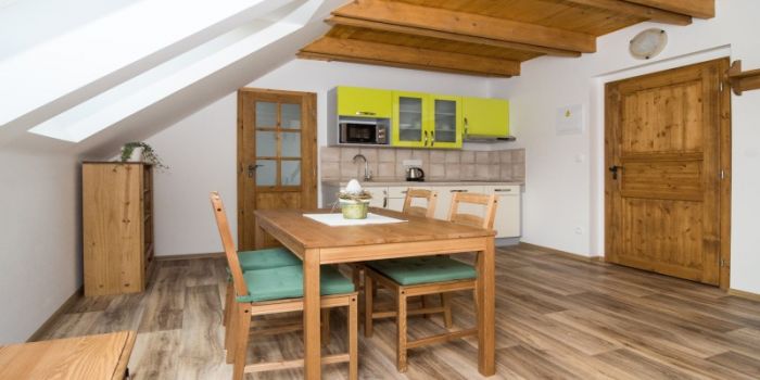 Apartmán Konvalinka - Kuchyňská linka je vybavena dvouplotýnkovým indukčním vařičem, vestavnou lednicí s mrazáčkem, mikrovlnnou troubou a rychlovarnou konvicí. Je zde jídelní stůl s židlemi, pohodlná rozkládací pohovka a televizní stolek s TV. Tento apartmán má samostatnou ložnici s manželským lůžkem a šatní skříní. Je zde i dostatek místa pro postýlku. Z kuchyně se stoupá po mlynářských schodech do podkroví, kde jsou další 4 lůžka. Pouze u toho apartmánu je WC oddělené od koupelny. Tento apartmán vedle herny. Doporučujeme rodinám s dětmi.