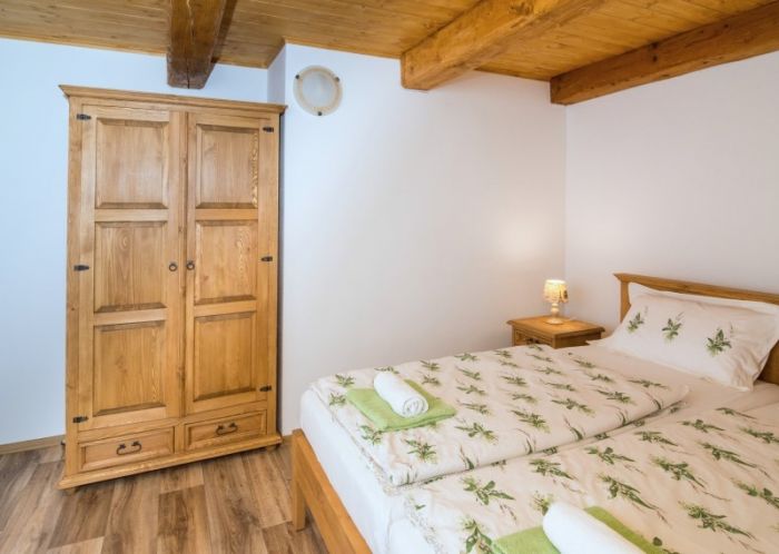 Apartmán Léto - Kuchyňská linka je vybavena dvouplotýnkovým indukčním vařičem, velkou lednicí s mrazáčkem, mikrovlnnou troubou a rychlovarnou konvicí. Je zde jídelní stůl s židlemi, pohodlná rozkládací pohovka a televizní stolek s TV. Tento apartmán má samostatnou ložnici s manželským lůžkem, s jednolůžkem a šatní skříní. Je zde i dostatek místa pro postýlku. Z kuchyně se stoupá po mlynářských schodech do podkroví, kde jsou další 2 samostatná lůžka.