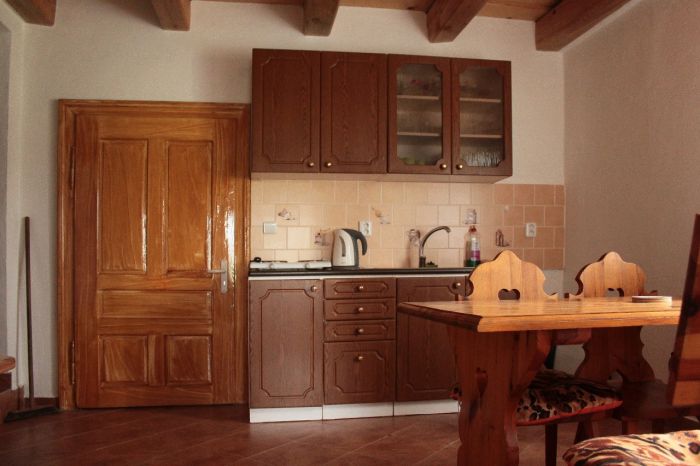 Kuchyň je plně zařízená, obsahuje ledničku s mrazákem, varnou desku/vařič, mikrovlnku, rychlovarnou konvici, nádobí, základní koření (sůl, pepř), nože, talíře, hrnce a hrnečky. Najdete zde vše, co pro vaření budete potřebovat.