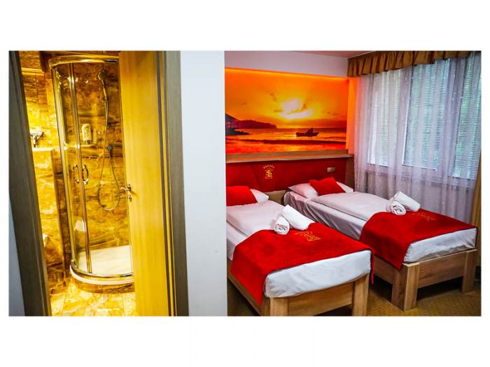 Bezdrátový internet zdarma, satelitní LCD TV, telefon, trezor, minibar, hotelový textil, sprcha, WC, fén na vlasy, ústřední topení, závěsy, toaletní potřeby, moderní nábytek, skříň a pracovní stůl, barevné LED podsvícení pokoje, hotelové parkoviště.