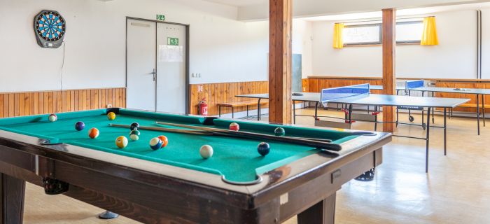 Vybavení: prolézačky - dětské hřiště ; 2x víceúčelové hřiště s umělým povrchem a osvětlením ; dětský koutek, herna – stolní tenis, kulečník, šipky ; trampolína ; Wi-Fi zdarma ; k zapůjčení možnost různého sportovního vybavení