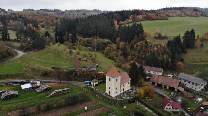 Při kácení stromů na stavbu kostela zahynul Antonín Berka z Věžné. Jeho smrt připomíná krásná mramorová deska s křížem a nápisem:,,Letha Panie 1594 na den Barbory swaté stromem zabit gest Antonín Berka z Wěžnýho. Pán Bůh racz dussi geho milostiw býti.“ Kámen je dnes zasazen před loveckým srubem z roku 1850 v bývalé daňčí oboře hraběte Mitrovského.