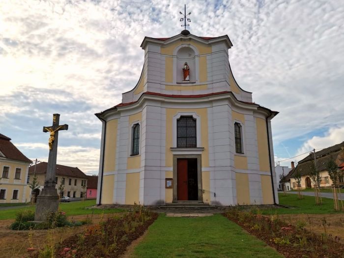 Původní kostel s jednolodím, západní věží a dvěma věžemi u východního kněžiště byl situován na vyvýšeném konci náměstí a tvořil dominantu obce. Santini se rozhodl razantně změnit dispozici kostela tím, že odstranil kněžiště a připojil k východnímu průčelí rozměrný halový prostor. Nové konkávně vyduté východní průčelí s bosovanými nárožími a sedlovými záklenky evokuje gotickou minulost kostela. Ve vrchní části rizalitu je umístěna nika se symboly sv. Petra a Pavla.