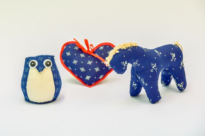 V nabídce mnoho druhů výrobků z modrotisku: chňapky, zástěry, ubrusy, prostírky, polštářky a také hračky - sovičky, koníci, medvídci a pejsci.