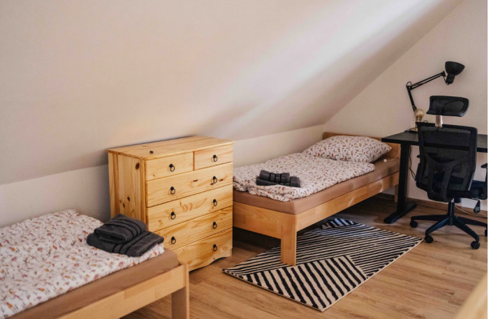 Disponuje čtyřmi polohovatelnými stoly pro práci, židlemi s opěrkami a zatemňovacími roletami. Plně vybaven i pro děti (postýlka, vanička, nočník, dětský koutek s hračkami).