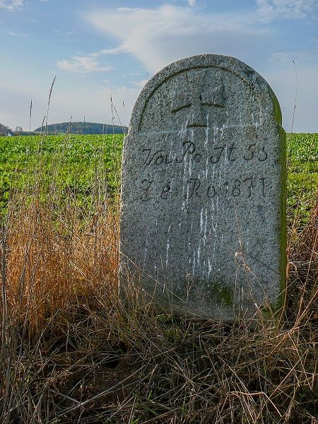 Kámen se vyskytuje uprostřed polí. Má rozměry 95x63x17cm. Je na něm vytesaný letopočet 1877 a několik písmen