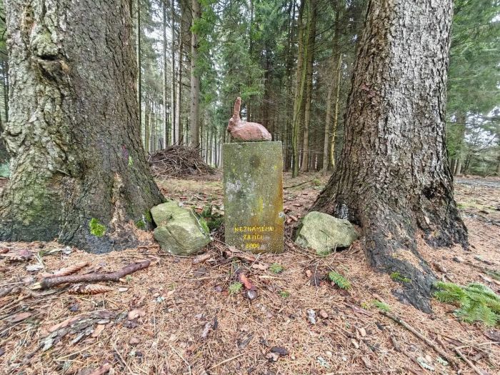 Poté, co od ‚vlka‘ vrátíme zpět na zpevněnou cestu, pokračujeme po ní dál a po pravé straně mineme na stromě připomínku tragického konce Josefa Pyšného z nedalekého z Lísku, který v těchto místech v lednu 1899 roku umrznul, a na samém konci komunikace odbočíme pěšinkou vlevo. Po necelých sto metrech vlevo uvidíme pomník věnovaný neznámému zajíci z roku 2005. Plastiku zajíce na podstavci v místě instalovali členové recesistického Prvního evropského neregistrovaného nevládního nezávislého dobrovolného vzájemně prospěšného občanského kruhu přátel restaurací a tvorby nových památek se sídlem v Brně coby poctu všem zajícům, kteří žili a také skončili svůj život v tamních lesích.