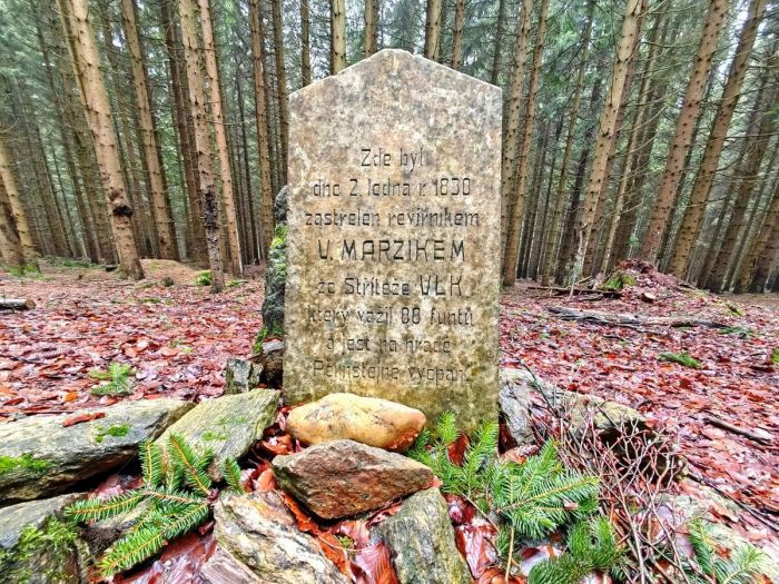 Pokračujeme po neznačené cestě vpravo a poté se napojíme vpravo na modrou, po níž dojdeme k rozcestníku Koníkovské polesí. Odtud si nejdříve zajdeme kousek po žluté ve směru k Zuberskému rybníku, a to ke Kubíkovu kameni, který byl vztyčen na památku Josefa Kubíka zabitého 19. února 1885 padajícím kmenem při kácení stromů. Vrátíme se zpět a sledujeme žlutou značku směr Vlčí kámen a pak neznačené pěšiny, abychom se dostali k další zastávce, již je pomník U Tří srnců. Kámen s erbem rodu Mitrovských má připomínat událost, k níž došlo kolem roku 1940, kdy Vladimír hrabě Mitrovský zastřelil jednou ranou tři srnce. A promptně nařídil, aby místo této události bylo označeno. Poté se již můžeme pustit k Vlčímu kameni – pomníku poslednímu zastřelenému vlkovi na Českomoravské vrchovině. Jak již bylo řečeno, pozůstatky zhruba půlmetrákového zvířete jsou k vidění na Pernštejně.