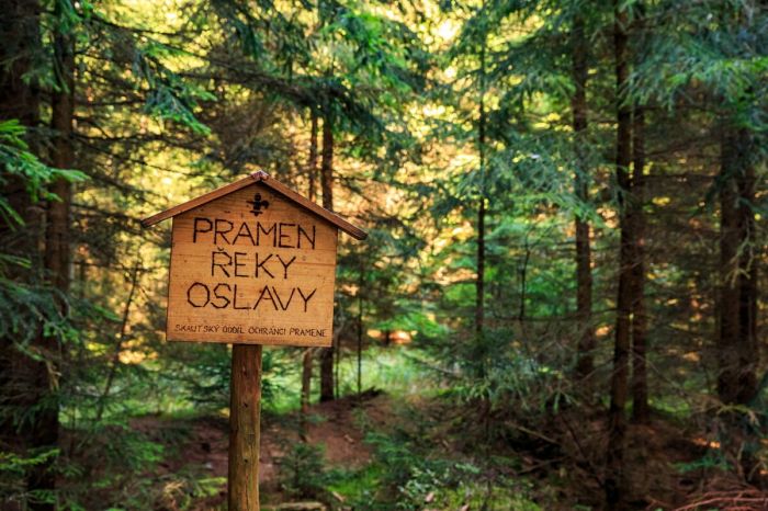 Cesta dál vede přes hráz ke až ke žluté značce, pak po ní vpravo a druhou odbočkou vpravo až do blízkosti skutečného pramene řeky Oslavy. Místo v lese je označeno informačními tabulkami, avšak nejedná se o žádnou romantickou studánku, nýbrž o soustavu podmáčených tůněk v mokřadech.