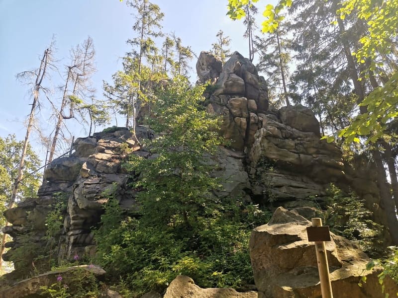 Z Odrance trasa pokračuje po žluté značce mezi poli k lesu a přes něj k rozcestí Pod Studnicemi. Odtud následuje krátká zacházka po zelené značce k osmistovce v podobě Pohledecké skály. V tomto případě se ale až na vrchol dostat nelze, neboť se tam nachází oplocený vojenský objekt s vysílačem. Mimo plot jsou některé skalky, avšak ty leží v nepřístupném území I. zóny Chráněné krajinné oblasti (CHKO) Žďárské vrchy.