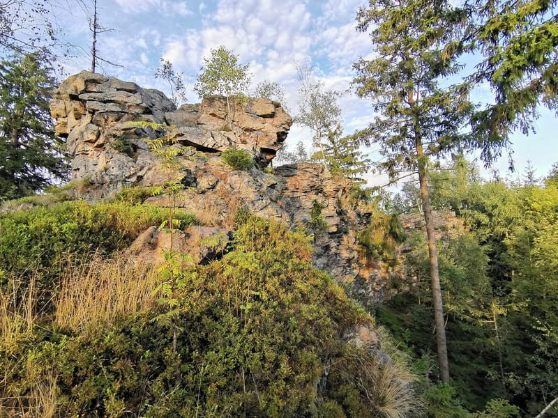 Červené značení procházející pod Devíti skalami spojuje i další osmistovky – první na trase je Lisovská skála (802 m n. m). Také tam se je možné dostat na vrchol. Necelý kilometr odtud se pak vpravo od značky rozkládá zalesněný vrchol Křovina (830 m n. m.) a za dalšího zhruba půl kilometru Suchý kopec (817 m n. m.), rovněž lesem porostlý vrchol. Pak červené značení směruje k Malinské skále (813 m n. m.), jež nabízí krásnou vyhlídku na okolí. Červená značka od ní klesne do malebné osady Blatiny, kde je mimo jiné možné navštívit kavárnu s vlastní pražírnou, další část trasy vede k silnici II/354 ve směru ke Sněžnému a poté z ní uhýbá vlevo do osady Podlesí. Tam se napojí na žlutou značku a z ní pak vlevo po neznačené cestě vystoupá k další osmistovce, kterou je zalesněný Vysoký kopec (806 m n. m.).