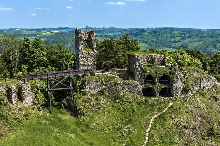 Start zhruba dvacet kilometrů dlouhého výšlapu je v centru Bystřice nad Pernštejnem, tam je například možné pod náměstím zavítat do specifického Depozit Veterán Tatra klubu umístěném v bývalém lihovaru. Nabízí k prohlídce desítky nablýskaných automobilových veteránů, kol či motocyklů a dalších předmětů spojených s motorismem. Městské muzeum v historickém objektu někdejší radnice na náměstí zase ukrývá i ojedinělou expozici živých ryb, případně uranu, protože právě uranová ruda, jež se na Bystřicku dobývala šest desetiletí až do roku 2017, měla zásadní vliv na novodobý rozvoj města. Tím se z rozhodnutí císaře Rudolfa II. stalo právě před 444 lety.