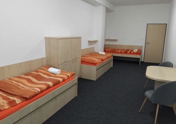 - Třílůžkový pokoj s možností až dvou přistýlek - ideální volba pro rodiny nebo skupiny. Pokoj disponuje třemi lůžky a možností dvou přistýlek. Ve vybavení nechybí skříň, stůl, židle, lednice a rychlovarná konvice. Koupelna s toaletou je sdílená vždy mezi dvěma pokoji.