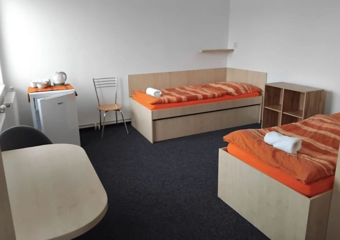 - Jednolůžkový pokoj s přistýlkou - pohodlný jednolůžkový pokoj s možností přistýlky je vybaven skříní, stolem, židlemi, lednicí a rychlovarnou konvicí. Koupelna s toaletou je sdílená s vedlejším dvoulůžkovým pokojem.