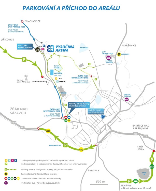 Parkování bude aktivováno pouze v případě nepříznivého počasí, kdy nebude možné parkovat na loukách u Vysočina Areny (platí jen ve dnech závodů a podle aktuální dopravní situace)