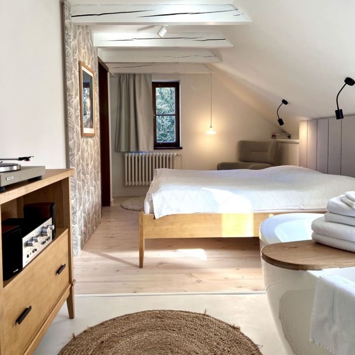 - Studia s vanou pro dva: Luxusní studia s prosklenými koupelnami a vanou přímo v pokoji, odkud můžete sledovat západ slunce nad zámkem.