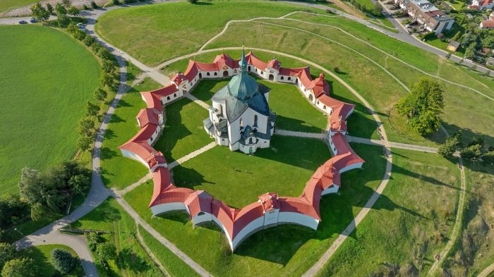 Poutní kostel na Zelené hoře, zapsaný na seznamu UNESCO, představuje absolutní vrchol tvorby Jana Blažeje Santiniho Aichela. Tato unikátní stavba ve stylu barokní gotiky je komponována na půdorysu pěticípé hvězdy, čímž architektonicky zhmotňuje legendu o svatém Janovi a symboliku čísla pět. Santini zde mistrovsky propojil dynamické křivky s prací se světlem, které modeluje vnitřní prostor. Kostel tak zůstává trvalým monumentem geniality, kde se hmota a geometrie proměňují v čistý duchovní prožitek.