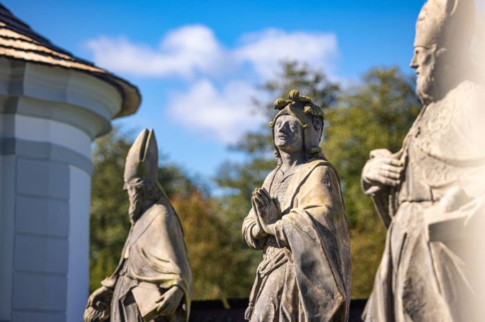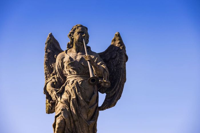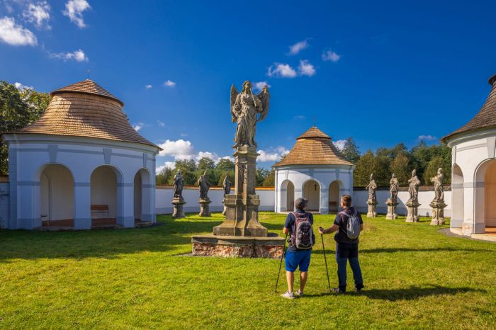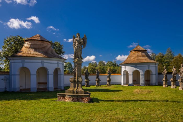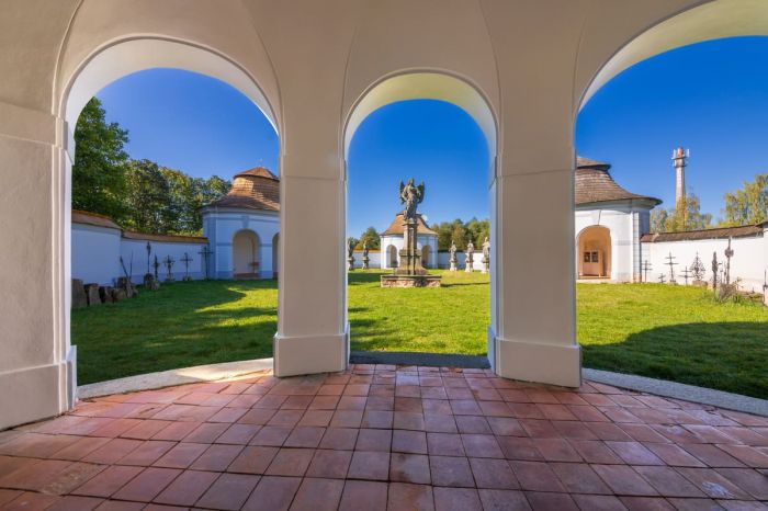 Středu areálu dominuje socha Anděla Posledního soudu, který zvedá k ústům polnici, aby dal signál mrtvým ke vzkříšení. Hřbitov byl později rozšířen o jednu kapli a jeho půdorys nyní připomíná lebku. I tak je dodnes cenným dokladem barokní symboliky a historie města.