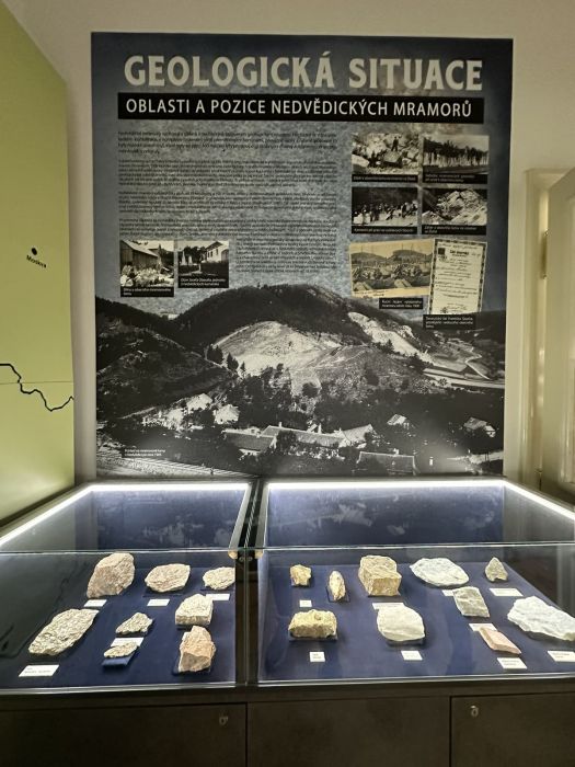 Návštěvníci však mohou obdivovat nejen lesk stříbra, ale i krásu místního nedvědického mramoru. Místnost je obohacena o ukázky bílého, šedého, modrého i vzácného růžového mramoru, který tvoří nezaměnitelnou tvář blízkého hradu Pernštejn. K vidění je i původní ruční kamenické nářadí a staré fotografie dokumentující historii těžby v regionu.