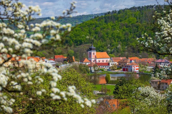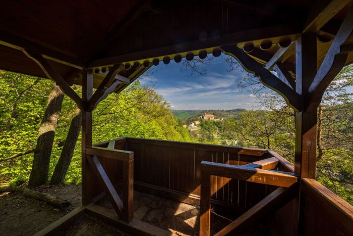 Zapálení turisté mají v Nedvědici na výběr ze tří naučných stezek. Červená trasa vás provede alejí staletých dubů, zatímco modrá vás vyvede až k romantickému altánu Maria Laube. Tuto vyhlídku nechal postavit hrabě Vladimír Mitrovský pro svou manželku Marii a dodnes nabízí ten nejkrásnější, téměř pohádkový pohled na siluetu Pernštejna. Pokud se rozhodnete pro delší, zeleně značený okruh, cesta vás zavede přes okolní kopce až do sousedního Doubravníku k monumentálnímu mramorovému kostelu.