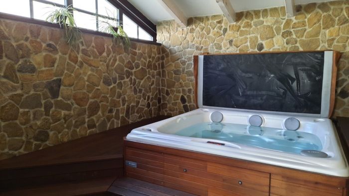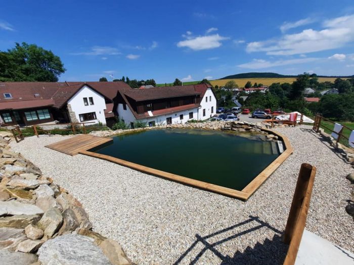 Součástí areálu penzionu je i wellness s vířivkou a finskou saunou s ochlazovacím vědrem a také odpočinková místnost.