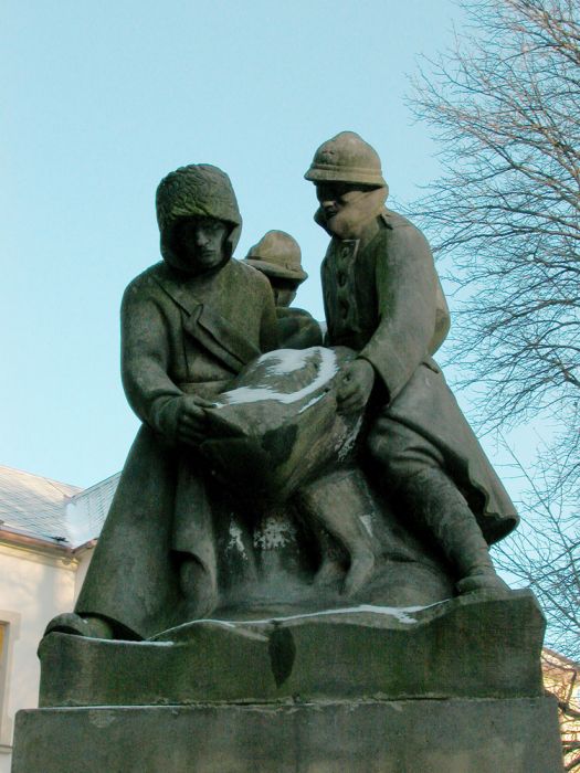 Pomník padlým vojínům vytvořil novoměstský rodák, sochař Jan Štursa. Inspirací k tomuto dílu byla autentická fotografie z karpatského bojiště. V původní studii pod názvem Pohřeb v Karpatech oblékl Štursa vojáky do rakouských uniforem. Tento nápad přepracoval ve 20. letech 20. století pro pomník obětem první světové války v uniformách legionářů a nazval ho Pomník padlým.