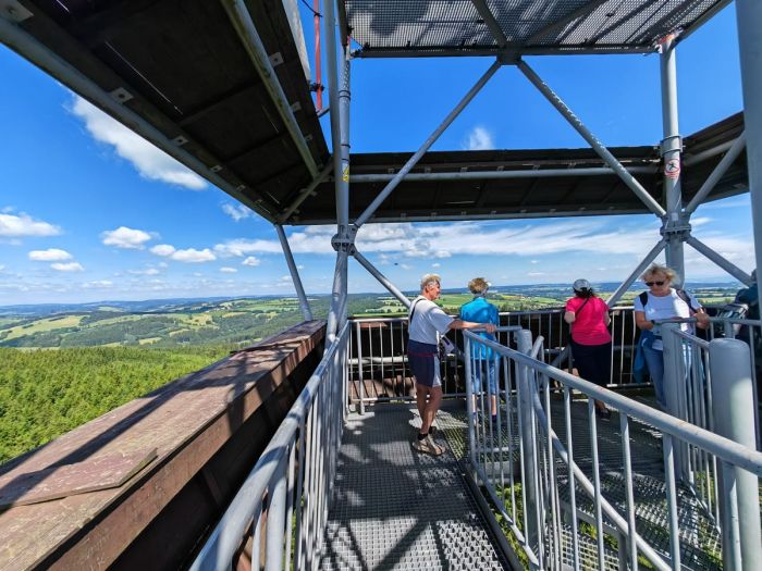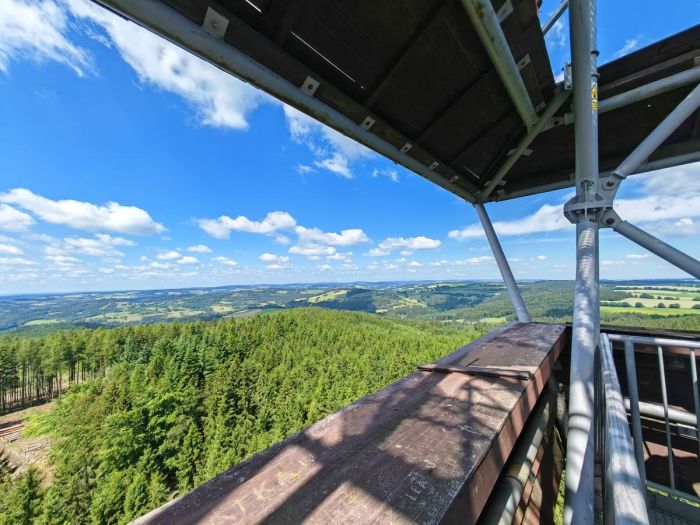 Vrchol rozhledny nabízí výhled na zajímavostí. Můžete si prohlédnout zříceninu hradu Zubštejna, část Bystřice nad Pernštejnem nebo hladinu přehrady Vír. Pokud se podíváte dále do okolí, uvidíte letiště v Poličce, TV vysílač Kojál, rozhlednu u Veselice v Moravském krasu, údolí Svratky, Harusův kopec u Nového Města na Moravě, Buchtův kopec, Daňkovice nebo masív Devíti skal. Za dobrých podmínek se dá dokonce vidět pára z jaderné elektrárny v Dukovanech, ale také Jeseníky, nejvyšší horu Moravy - Praděd a vzácně i Krkonoše.