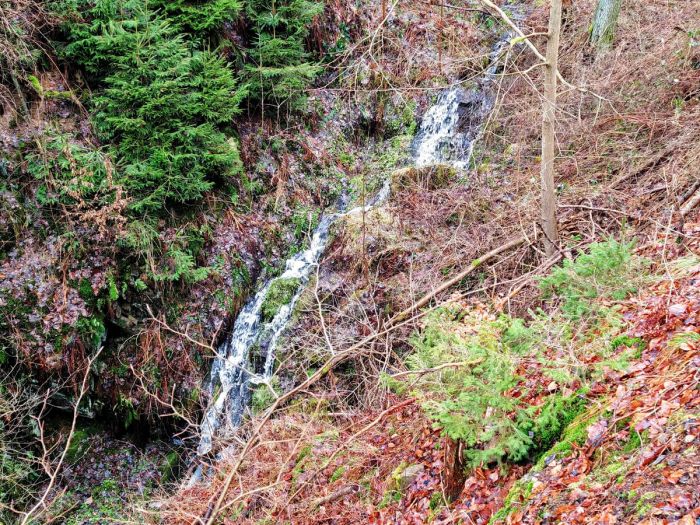 Pod soutokem se v skalní soutěsce nachází dva metry vysoký vodopád. Zhruba 50 metrů níže je další vodopád, který je vysoký 1,6 metru. Potok poté pokračuje svým skalnatým korytem, kde vytváří nádherný systém kaskád a vodopádů. Asi 150 metrů před prvními domky v Ujčově potok padá přes nejvýraznější skalní stěnu v korytu, vytvářející impozantní vodopád. Oba stupně jsou přibližně stejně vysoké, a dohromady tvoří vodopád o výšce 9 metrů.
