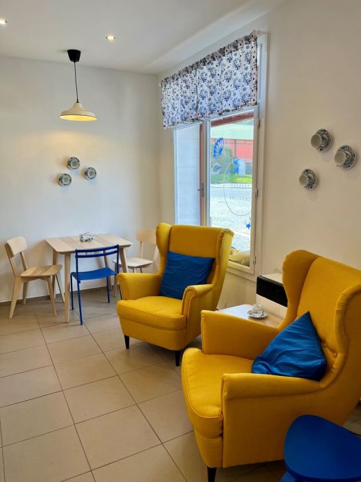 V interiéru kavárny laděném do modrobíla dominuje tradiční cibulákový motiv, který odkazuje na historii i folklor a svými čistými liniemi podtrhuje prožitek z příjemného posezení v útulném prostředí.