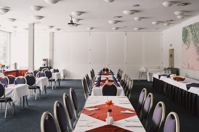 Pro tyto účely máme připraveny eventové prostory. První sál pojme až 150 hostů, druhý kolem 20–60 hostů. Stoly se dají uspořádat dle vašeho přání a potřeb meetingu.