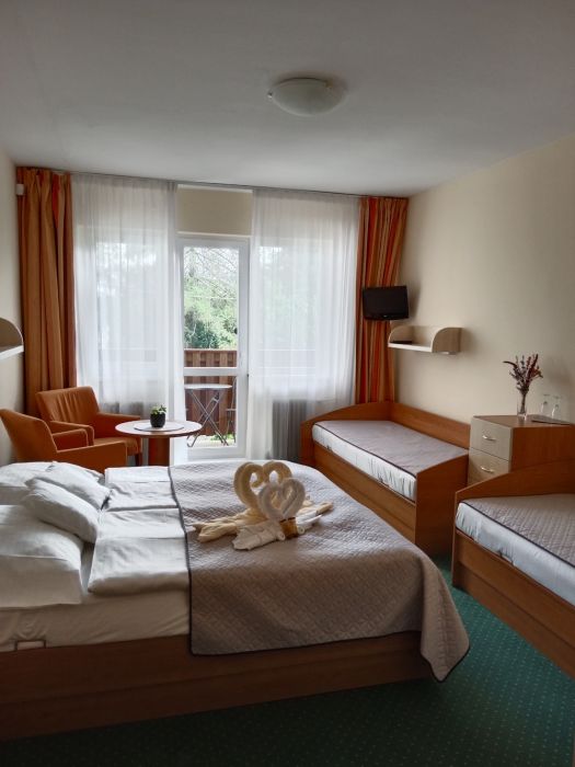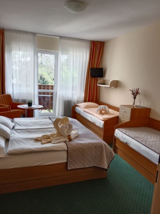 - 12 pokoji s manželskou postelí a 2 oddělenými lůžky. Každý pokoj má vlastní sociální zařízení a balkón s posezením.